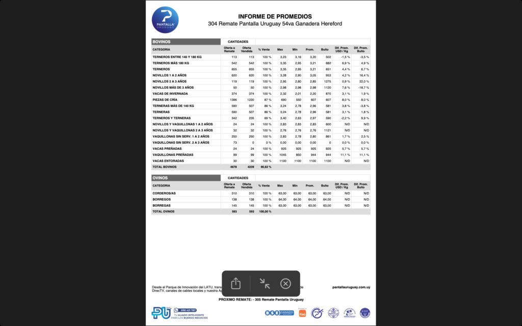 El remate conjunto de Ganadera Hereford y Pantalla Uruguay cerró con un notable éxito, superando ampliamente el 90% de colocación de la hacienda ofertada. El mercado se mostró ágil, con una demanda sostenida que respaldó los valores, manteniendo la firmeza en los precios en la mayoría de las categorías.