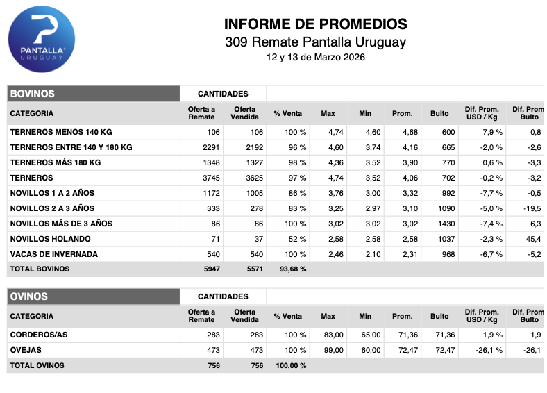 En la primera jornada del remate 309 de Pantalla Uruguay, celebrada este jueves 12 de marzo de 2026, el mercado de reposición mostró una notable estabilidad y firmeza. Con una colocación del 93,68% de los ganados de invernada, el evento ratificó la demanda activa que sostiene el sector.