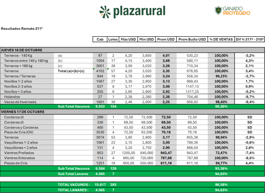 El consorcio de escritorios Plaza Rural finalizó con éxito su remate 311, llevado a cabo los pasados jueves 16 y viernes 17 de octubre. Con una importante oferta de más de 16.300 vacunos y casi 5.000 ovinos, la subasta logró una colocación del 97%, reflejando la solidez y el dinamismo del mercado ganadero.